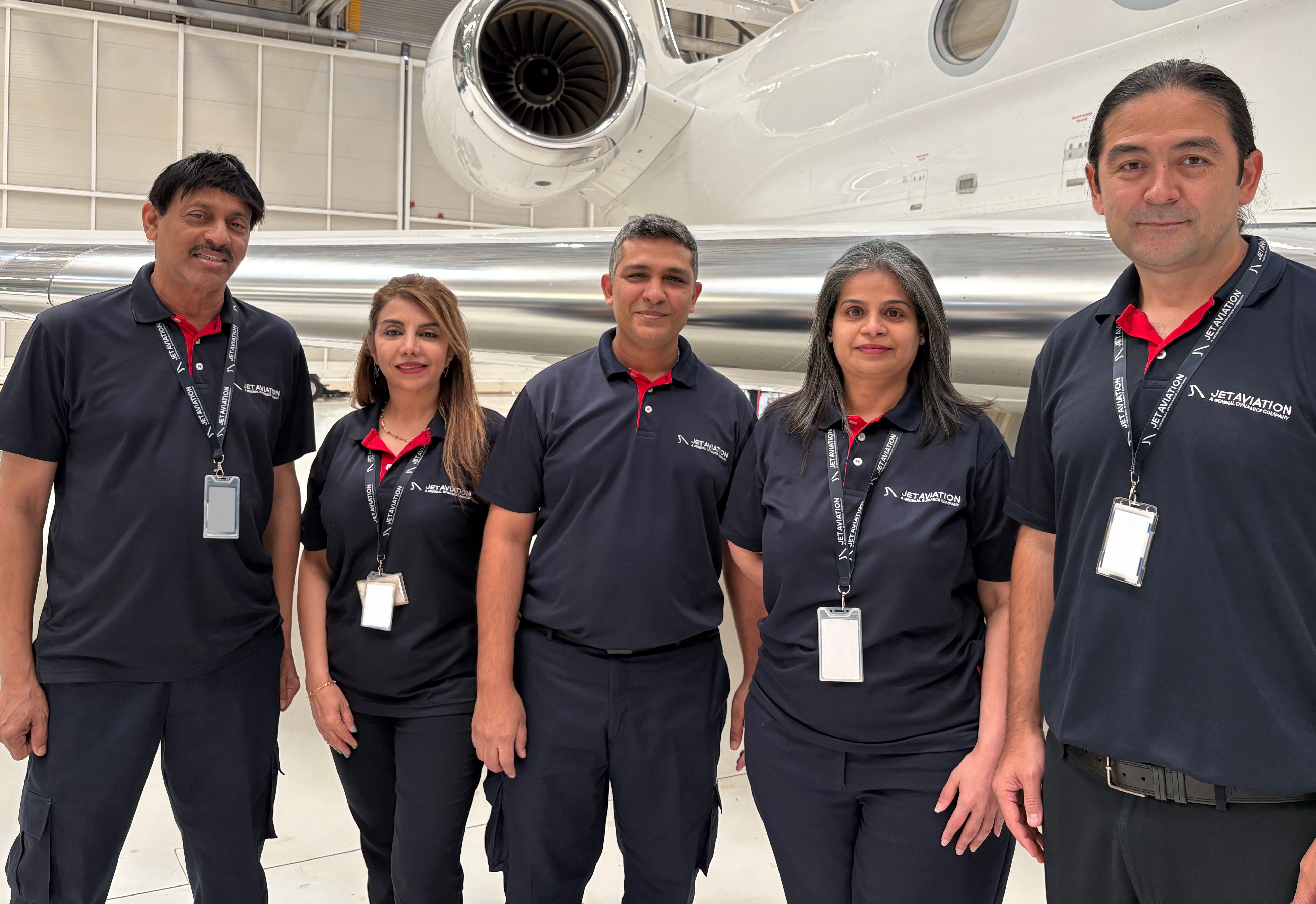 Above: Fereshteh Zarnegar (second left), Jansen Machado (center), and Chrisann Duarte (second right), with Oliyantakath Mammi Moidu (left), and Amir Khan (right), some of the first employees of Jet Aviation Dubai